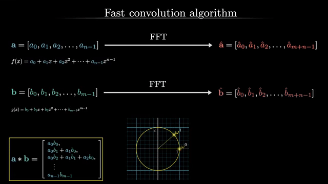 This immediately explains the baseline complexity story. Direct convolution uses many pairwise products and additions, giving $O(n^2)$ work for length-$n$ inputs. The lecture then reframes the problem in value space: evaluate polynomials at selected points, multiply values pointwise (cheap), and recover coefficients. Naively that is still not better, but roots of unity create enough algebraic redundancy that FFT and inverse FFT perform both direction changes in $O(n\log n)$ [1][4].